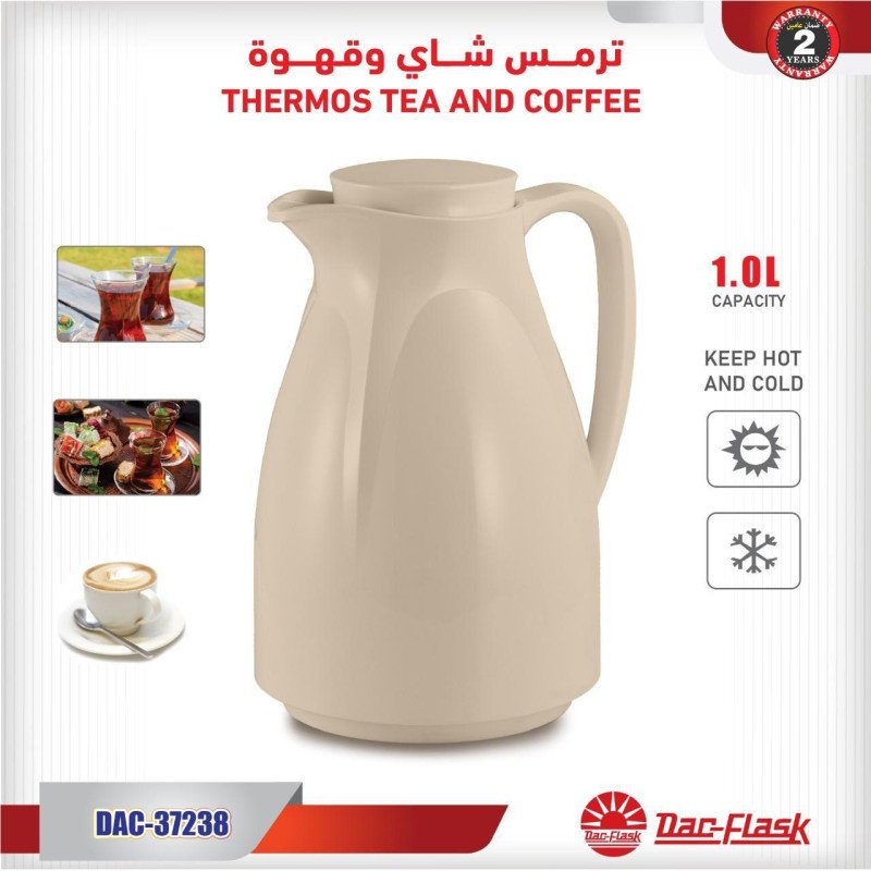 استمتع بمشروبك الساخن أو البارد لفترات طويلة مع ترمس شاي وقهوة بسعة 1 لتر. يتميز بتصميم أنيق وعصري مع بطانة زجاجية للحفاظ على درجة حرارة المشروبات لفترة أطول. مثالي للاستخدام اليومي في المنزل أو المكتب أو أثناء السفر. مصنوع من مواد عالية الجودة ويأتي مع ضمان لمدة سنتين.