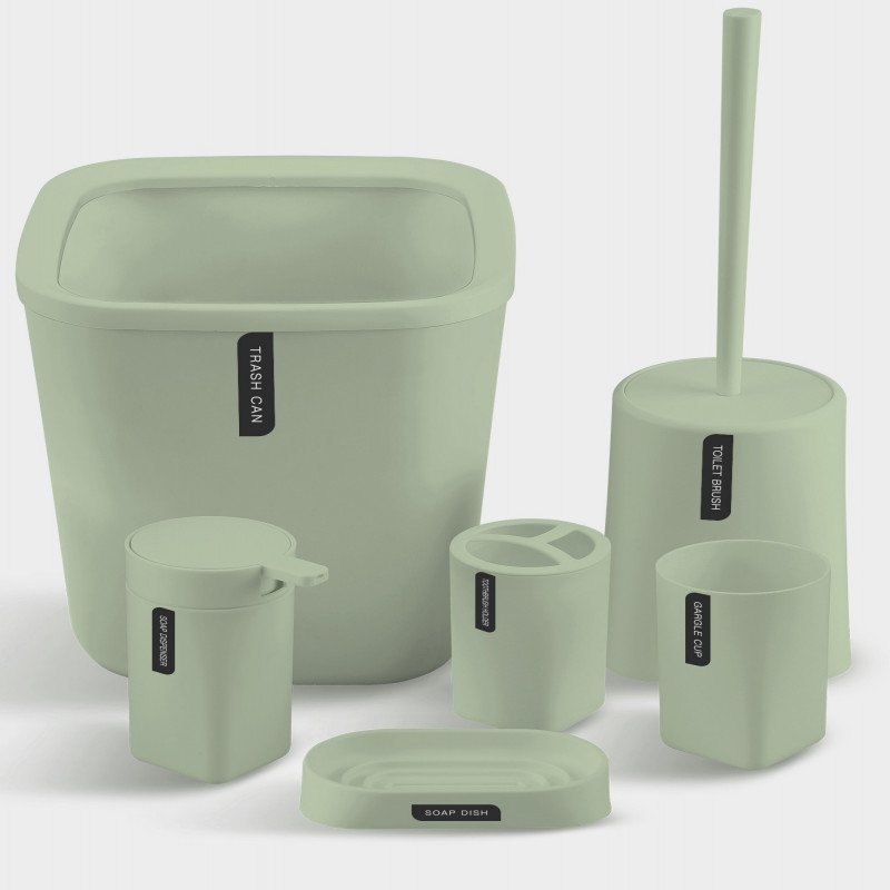 تتضمن المجموعة: سلة مهملات ، وفرشاة مرحاض ، وموزع غسول ، وحامل فرشاة أسنان ، وكوب غرغرة ، وصحن صابون