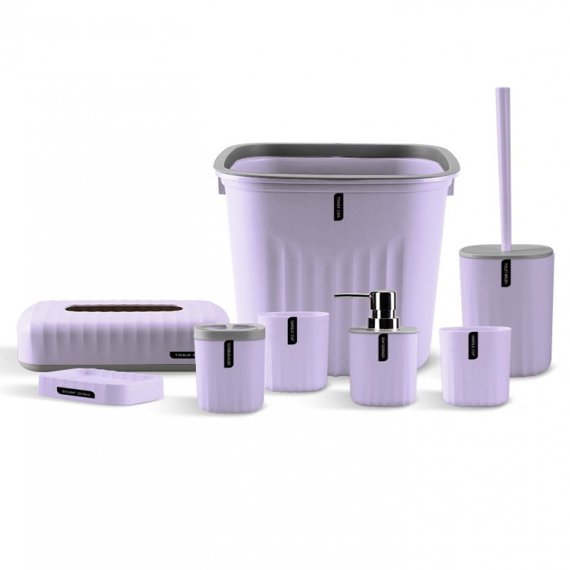 سلة مهملات ، طبق صابون ، موزع غسول ، 2 كوب ، حامل فرشاة الأسنان ، حامل فرشاة المرحاض ، حامل مناديل