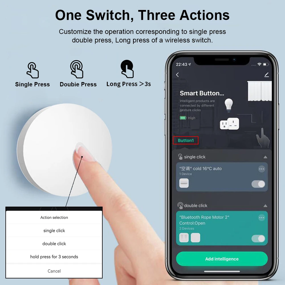 To create any smart automation as you want on your smart phone app to start your another intelligent lifestyle,no more voice command needed,no more time to open your app,only simple operation required to trigger the scenes you have set,when you are tired from one-day work,such as home mode,shower mode or sleep mode.Waterproof level up to IP55 for wider applications.